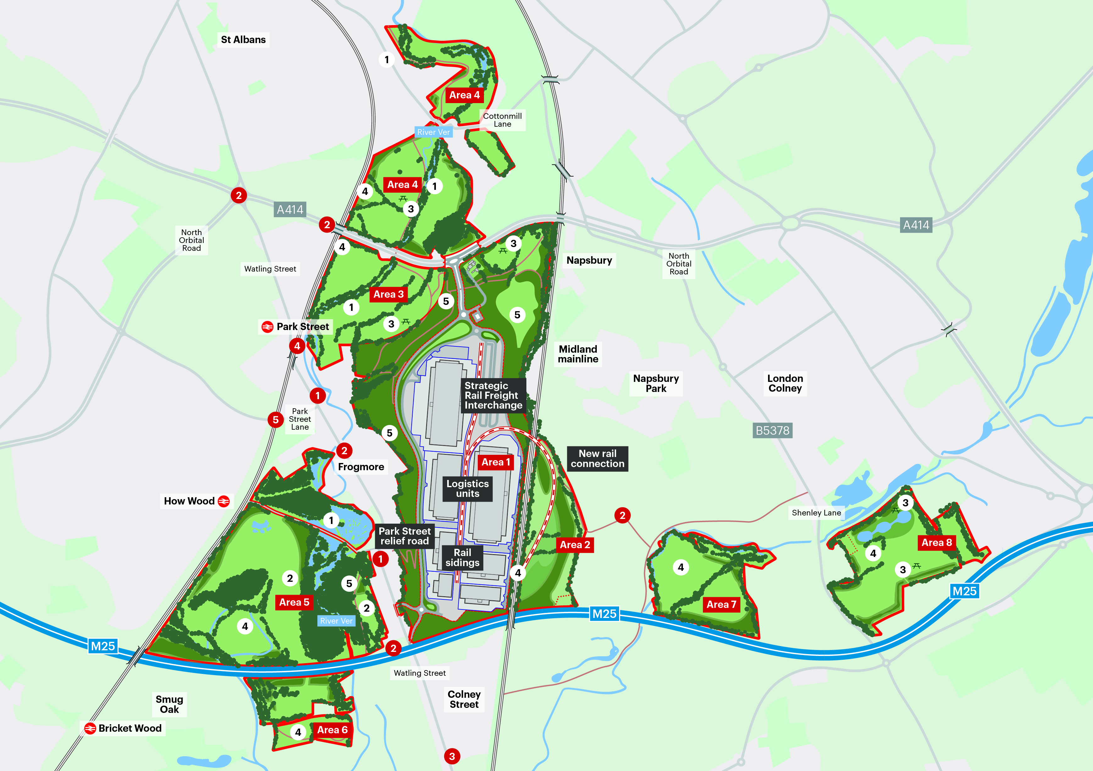 The vision for SEGRO Logistics Park Radlett is to create 335,000 sq m of state-of-the-art, sustainable logistics space, enabled by a Strategic Rail Freight Interchange (SRFI) on site, enveloped in 600 acres of managed woodland, conservation grazing and public country park.
